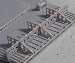 甲板の横のパーツを取り付けました。トラスに穴をあけましたが、下から見ないと全然目立ちません。効果は余り無かった様です・・・。あと、横のパーツの取り付けで、隙間が出来てしまいました。プラ材を埋め込むなどの修正が必要です。