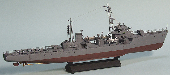 カッターと内火艇を取り付けました。ダビットから吊り下げているようですが、詳細の資料がなかったので目だつバンドの工作だけて済ませています。バンドにはコピー紙を使いました。