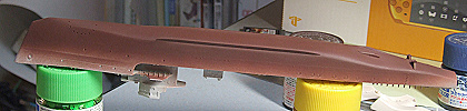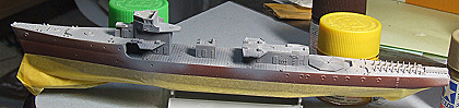 船体上の構造物の製作に取り掛かる前に艦艇色を塗りました。タミヤのハルレッドを使いましたが、少々暗いようなので、溶剤で薄めたフラットレッドを塗って調整しました。舵はマスキングの都合で一旦、切り取りました。あとで取り付けます。
