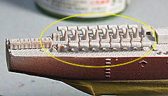 1/350のスケールだと手摺が無いと寂しいので、つけることにしました。参考となる資料をネット等で探しましたが、みつからなかったので、考証はナシです。手摺にはアオシマの「重巡洋艦 妙高型 共通手摺エッチングパーツ」を使いました。