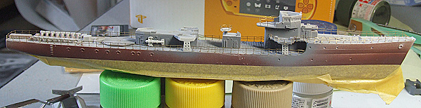 喫水線より下をマスキング。ここから上部構造部分の製作ですが、全てのパーツを取り付けてからは塗りにくい部分を先に塗装しました。