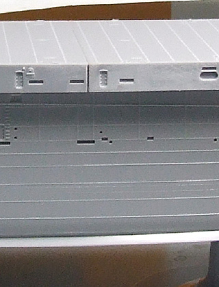 甲板の横のパーツを取り付けました。トラスに穴をあけましたが、下から見ないと全然目立ちません。効果は余り無かった様です・・・。あと、横のパーツの取り付けで、隙間が出来てしまいました。プラ材を埋め込むなどの修正が必要です。