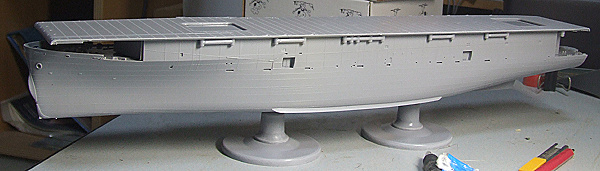 甲板を載せてみました。空母の形状は見た目が単純なので、これで完成まで近いような気になります。